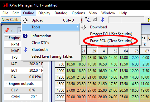 In KPro Manager, go to the Online menu and select Erase ECU (Clear Security) before you can upload to ECU.