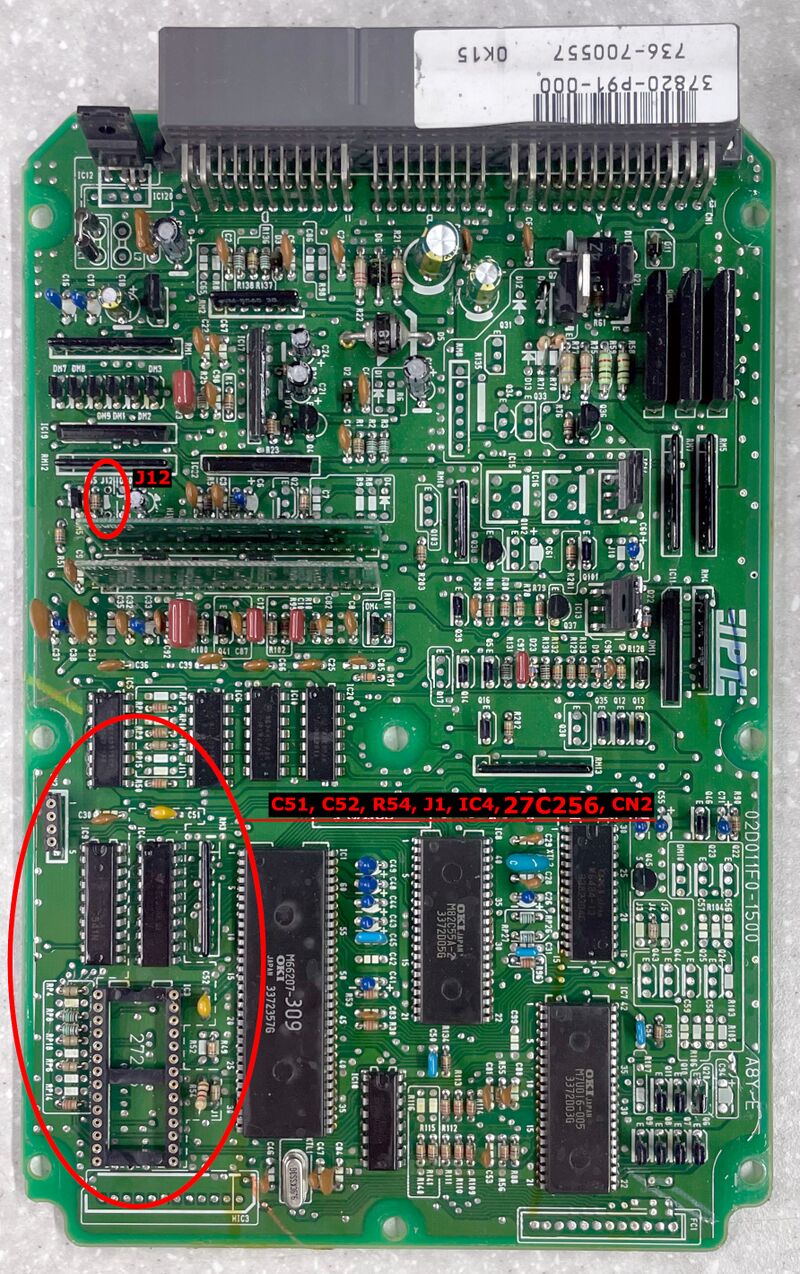 Eight components must be modified on the top side: J1, R54, C51, C52, IC3, IC4, CN2, J12