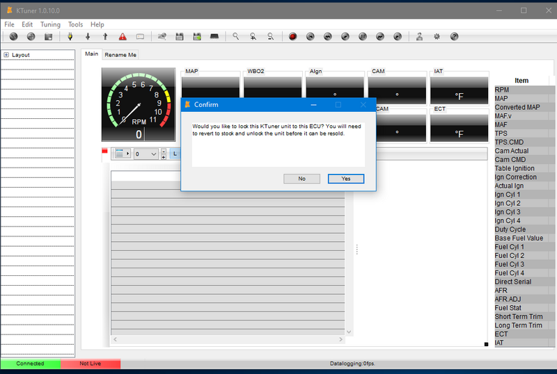 Switch ignition ON. KTuner will detect the ECU and offer to lock the CANFlash device. Click Yes.