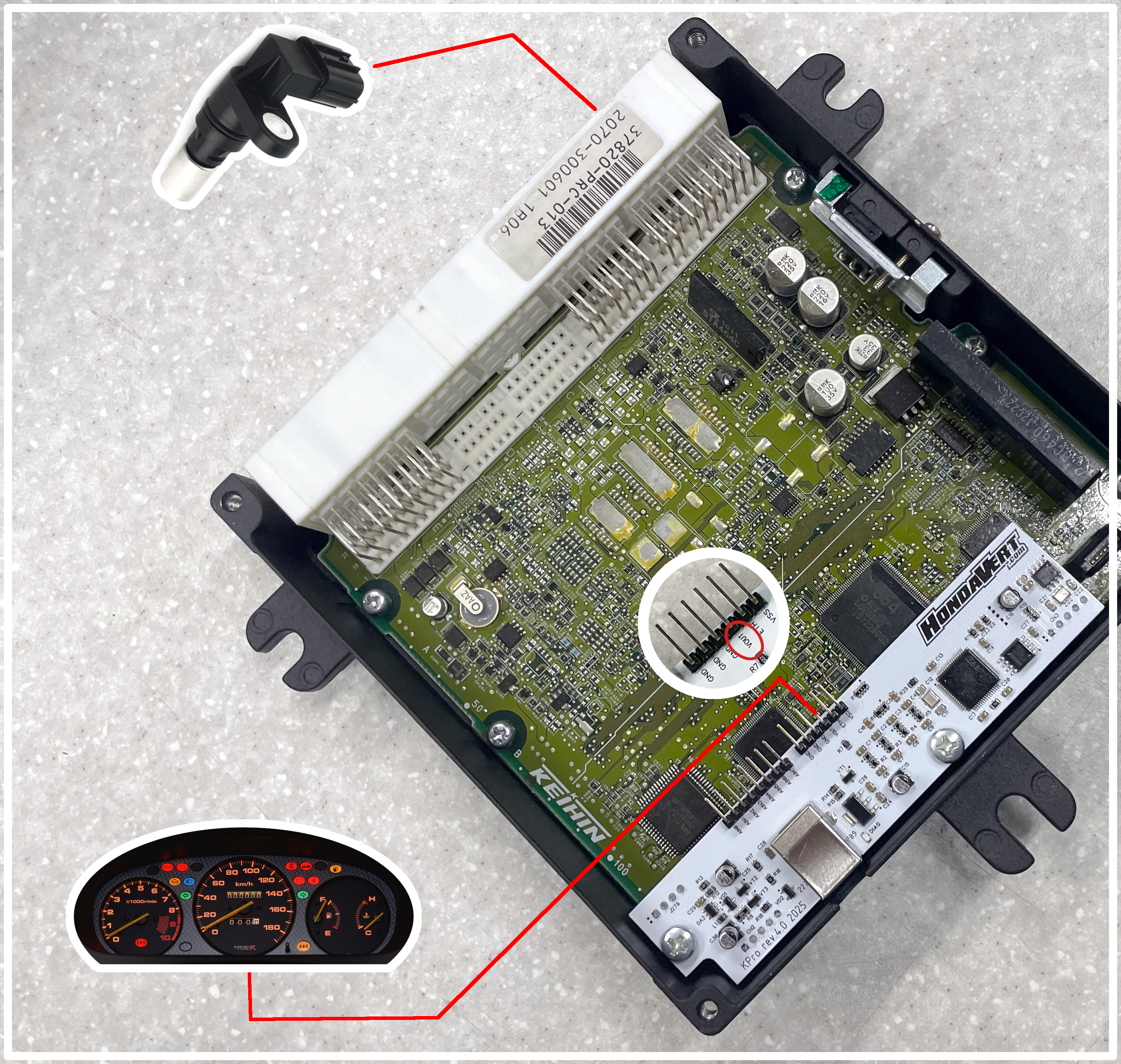 - Connect the VOUT Pin from the KPro v4 board to the instrument cluster speed signal input.